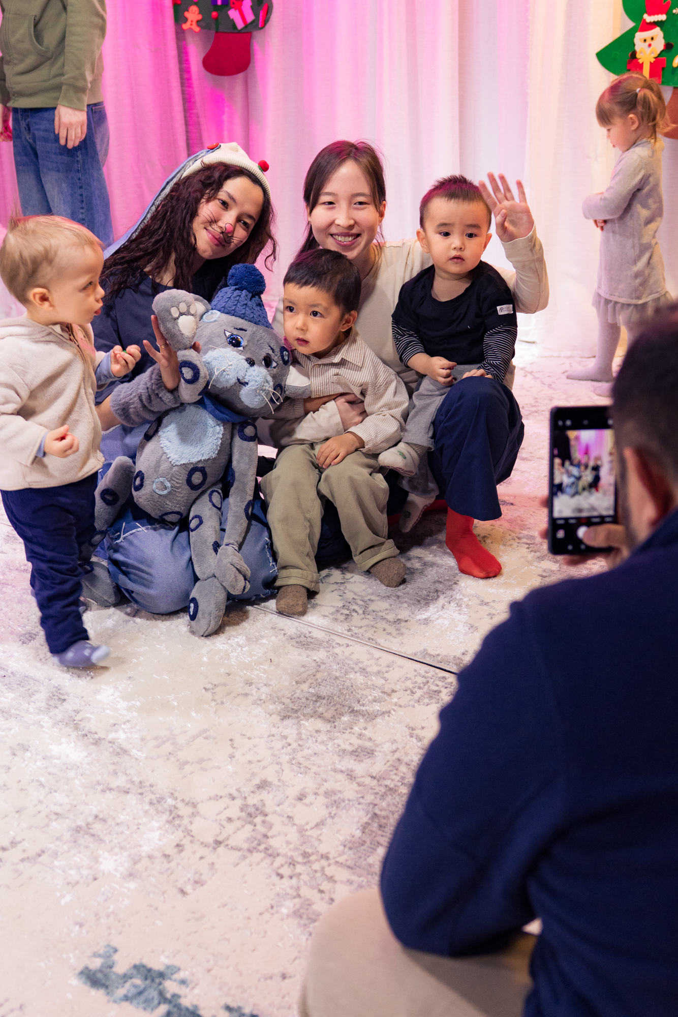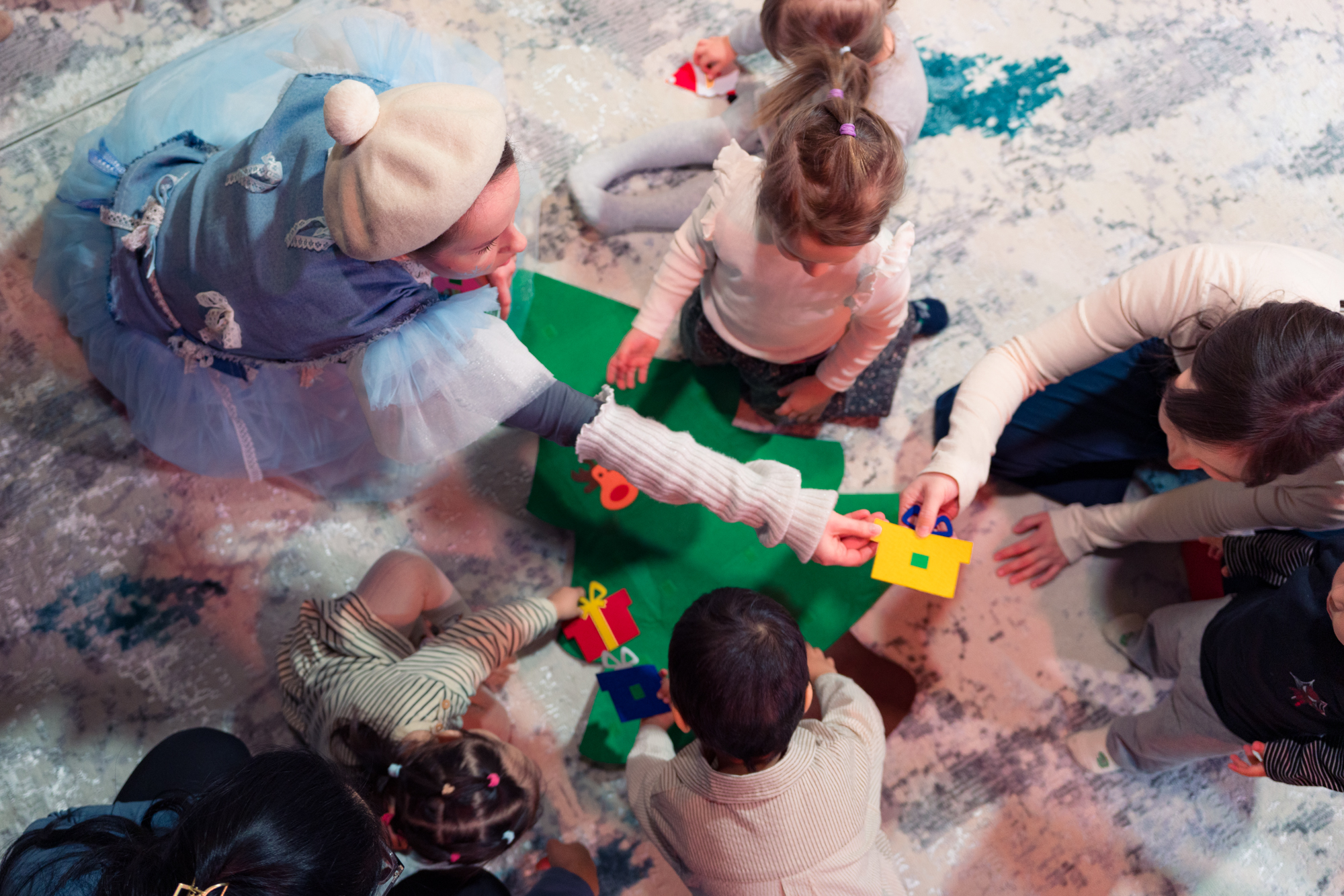 Обстановка полностью безопасная: дети вместе с мамами, в носочках, на тёплом мягком ковре — прямо рядом с героями сказки.
