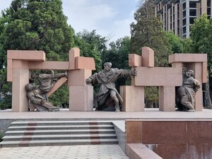 - Скульптурная группа у подножия памятника олицетворяет дружбу народов.