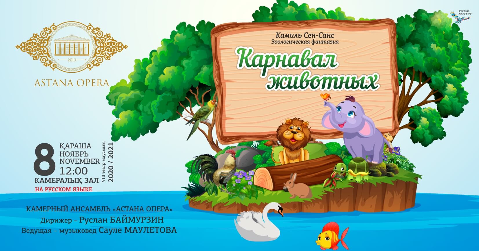 «Астана Опера» представляет музыкально-поэтический концерт для детей. Будет исполняться одно из самых известных произведений, написанных специально для юных зрителей – сюита «Карнавал животных» французского композитора Шарля-Камиля Сен-Санса. Ребята услышат, как звучат инструменты симфонического оркестра, как они способны подражать голосам и передавать повадки животных и птиц. Вместе с артистами дети окажутся в городском зоопарке на Карнавале животных.